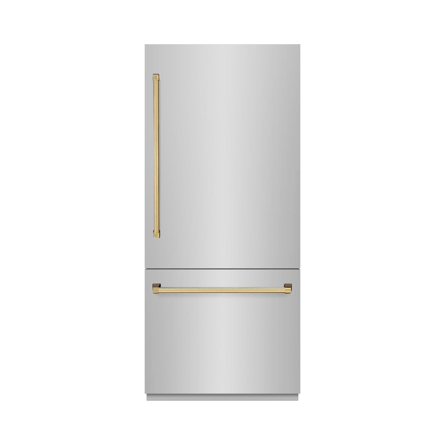 ZLINE Autograph Edition 36 in. 19.8 cu. ft. Built-In Bottom Freezer Refrigerator with Water Dispenser and Ice Maker in Stainless Steel with Polished Gold Accents (RBITZ-304-36G)