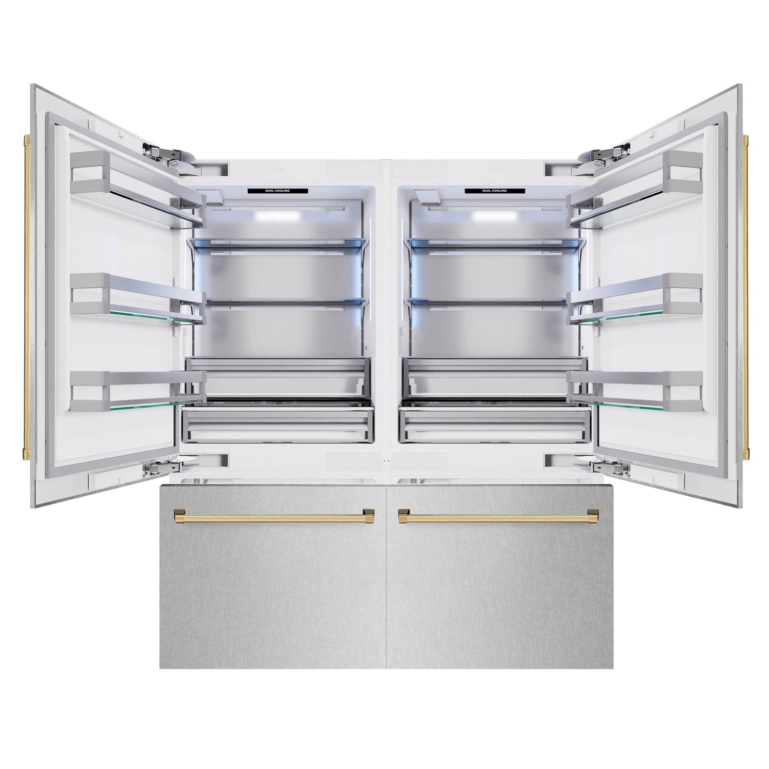 (P)Luxury isn't meant to be desired - it's meant to be attainable. The ZLINE Autograph Edition 72 in. 39.6 cu. ft. French Door Built-In Bottom Freezer Refrigerator with Water Dispensers and Ice Makers in DuraSnow' Stainless Steel and Polished Gold Accents (RBITZ-SN-72-G) provides the ultimate upgrade to the center of your home by pairing premium dual cooling technology with enhanced storage capacity for multiple grocery items. Achieve ZLINE Attainable Luxury' excellence with innovative features designed to enhance your kitchen's cooling and freezing capability.(/P)(B)(BR)This product contains many unique features such as:(BR)(/B)(UL)(LI)(B)Autograph Edition Series(/B) - Enjoy a timeless look with 4 luxurious Polished Gold accent handles, giving your built-in refrigerator an elegant, unmatched style(/LI)(LI)(B)Custom Door Panel Finish(/B) - Create a timeless look in your kitchen with a true flush installation paired with elegant DuraSnow' stainless steel door panels that deliver superior durability(/LI)(LI)(B)Flex Drawers(/B) - 2 specialty flex drawers feature 4 set temperature options between 30'F and 41'F, perfect for chilling wines, specialty meats, and other items for any occasion(/LI)(LI)(B)Spacious Storage(/B) - Comfortably organize grocery items inside a built-in unit featuring 28.4 cu. ft. of refrigeration space and 11.2 cu. ft. of freezer space ? totaling 39.6 cu. ft. of interior capacity(/LI)(LI)(B)Bright White Interior(/B) - Achieve ZLINE Attainable Luxury' excellence by pairing best-in-class freshness with Bright White interior units featuring exceptional dual cooling technology(/LI)(LI)(B)Digital ChillControl(/B) - An ergonomic LED display allows you to quickly change temperatures and navigate menu options to change the appliance to vacation, sabbath, or eco modes(/LI)(LI)(B)Adjustable Temperatures(/B) - Create the perfect cooling environment with fridge temperatures ranging from 35'F to 46'F and freezer temperatures ranging from -11'F to 5'F(/LI)(LI)(B)Water Dispensers and Ice Makers(/B) - Deliver fresh, filtered water discreetly from 2 water dispensers in the fridge and produce up to 8 pounds of daily ice with 2 automatic ice makers in the freezer(/LI)(LI)(B)Soft-Shut Technology(/B) - Smooth-closing fridge drawers seamlessly open and close ensuring heavily used components are enjoyed for years to come(/LI)(LI)(B)DuraSnow' Stainless Steel(/B) - ZLINE's proprietary non-directional DuraSnow' stainless steel is an everlasting finish that is scratch-resistant and fingerprint-resistant(/LI)(LI)(B)LED Illumination(/B) - Easily spot items inside both fridge compartments thanks to cool white LED interior lights along the walls and ceiling that illuminate when you open both doors(/LI)(LI)(B)Full-Width Pantry Drawers(/B) - 2 full-width pantry drawers provide substantial storage for fruits, vegetables, and other food items you want to keep fresher longer(/LI)(LI)(B)Adjustable Shelves and Bins(/B) - Easily store larger items with 6 spill-resistant glass shelves and 6 door bins in the fridge compartment, as well as 4 full-extension drawers in the freezer(/LI)(LI)(B)Super Cool and Super Freeze Modes(/B) - Save time and quickly chill food with unique functions that automatically set the fridge temperature to 35'F and freezer to -12'F(/LI)(LI)(B)Dual Cooling(/B) - Separate fridge and freezer cooling systems ensure air and odors are not mixed between compartments and provide fast and efficient cooling(/LI)(LI)(B)ENERGY STAR' Rated(/B) - Enjoy energy savings while maintaining professional power with superior insulation and an energy-reducing cooling system(/LI)(LI)(B)Warranty(/B) - 2-year parts and labor warranty, 5-year parts-only sealed system warranty(/LI)(LI)(B)Installation Disclaimer(B) - This refrigerator is two (2) separate 36-inch units that are required to be installed with two (2) 15 amp outlets and two (2) water lines installed together with the included trim kit(/B)(/B)(/LI)(LI)(B)Additional Assembly Required(B) - This refrigerator and its door panels and handles will ship in multiple boxes, requiring assembly upon installation(/B)(/B)(/LI)(/UL)