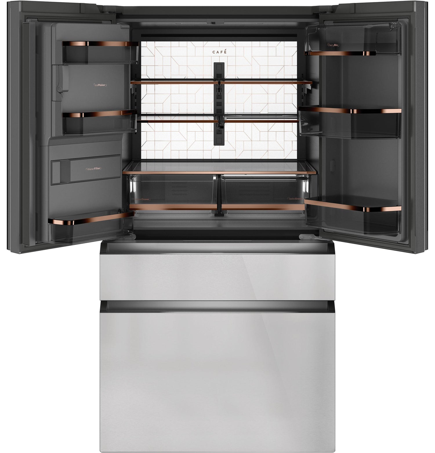 - The counter depth refrigerator with gray interior and signature Café copper accents complements the LED light wall for stunning style inside and out