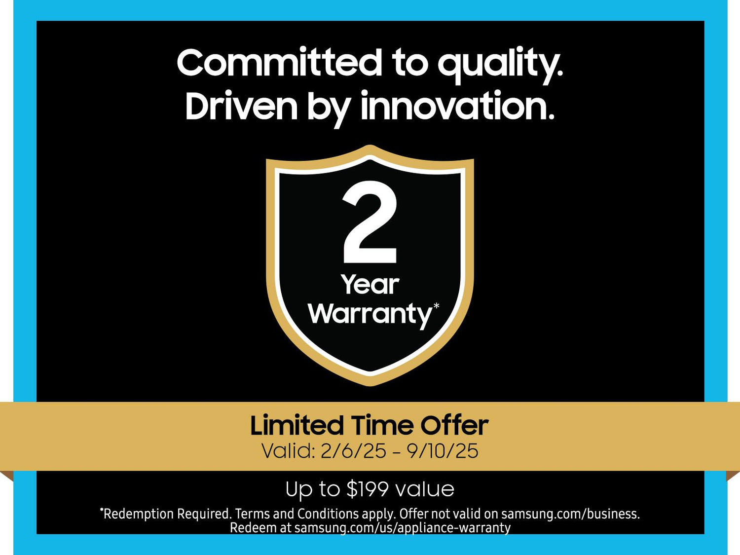 Receive an extended 2 year manufacturers warranty valued up to $199 with purchase of qualifying Samsung appliances.