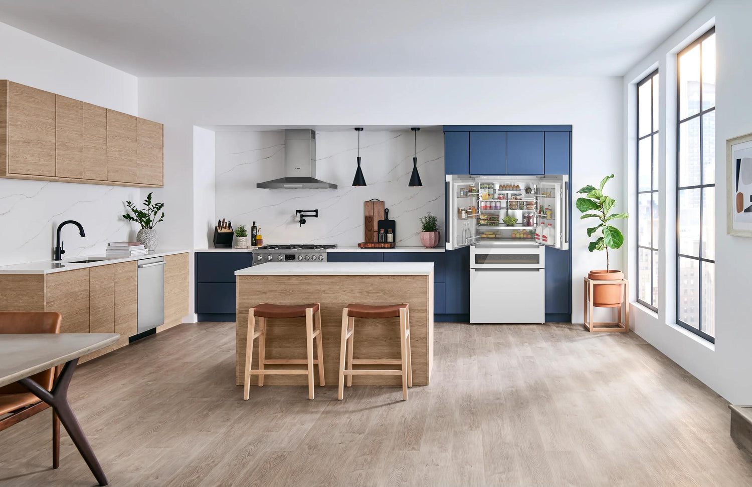 Sits flush with the countertop, with hidden hinges and discreet, tucked away feet. Sleek, freestanding stainless-steel refrigerators effortlessly look and feel built-in.