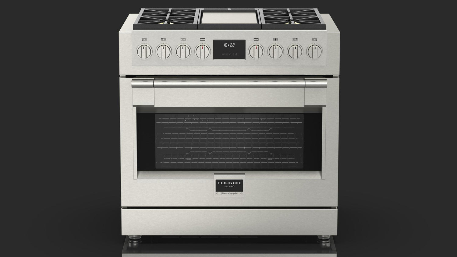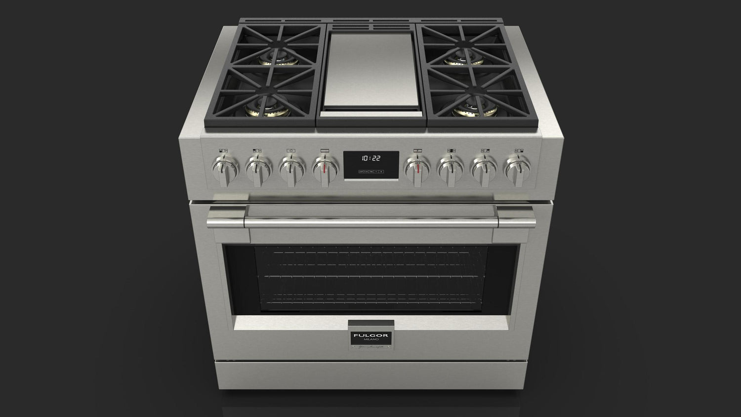 (P)This all-new 36" all gas range comes with (B)4 burners and a central griddle(/B). Each burner features our 5-in-1 Crescendo burner beneath our continuous heavy-duty cast-iron grates with the same (B)Trilaminate Stainless Steel griddle(/B) as our 48" ranges, providing unparalleled flexibility in a 36" range. The (B)Crescendo burner(/B) has the power to sear, saut(eback), and boil but also the control to temper and simmer the most delicate dishes.(/P) (P)The heart of Sofia is her oven with dual convection, commercial-style racks, multi-level lighting, and a full-extension rack with stainless glides. With the (B)Nova Broiler system(/B), intense heat sears meats and fish, locking in juices. The large broiling area coupled with the ventilation allows for closed-door broiling, which ensures constant cooking.(/P) (P)And you can create your (B)personalized nameplate(/B) for the oven door.(/P)