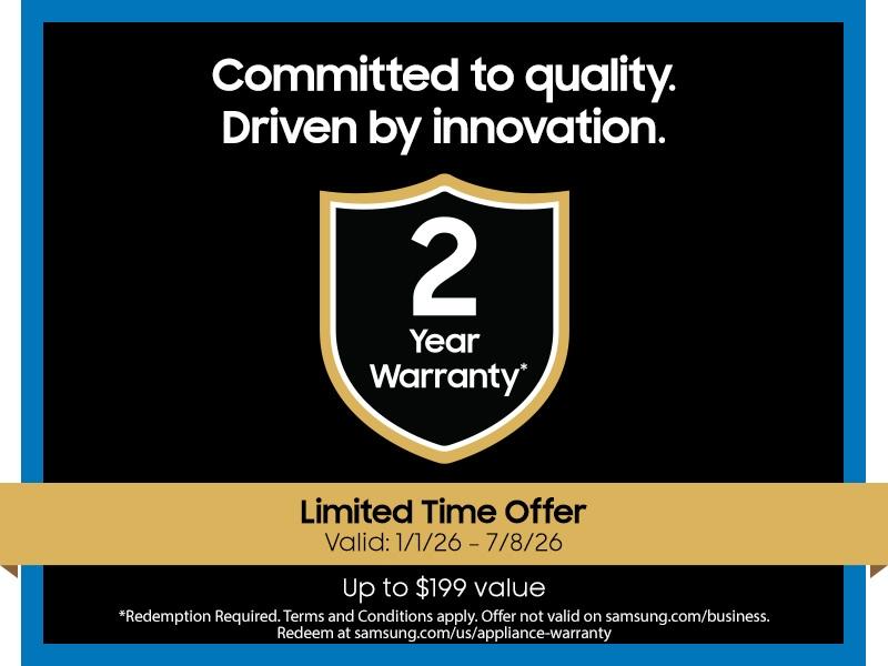Receive an extended 2 year manufacturers warranty valued up to $199 with purchase of qualifying Samsung appliances.