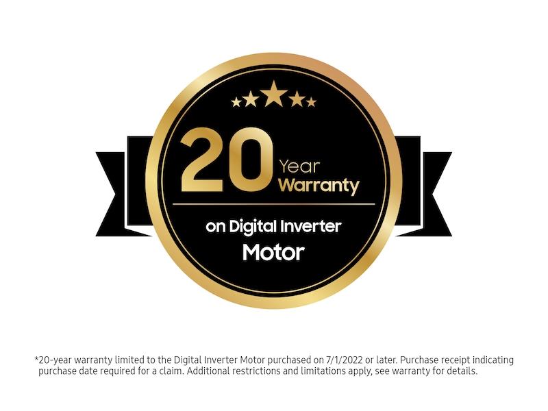 - Samsung washing machines are covered by a 20-Year Warranty on the Digital Inverter Motor.