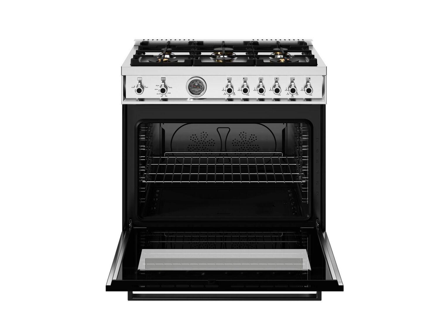 Bertazzoni Professional Series ranges bring the authentic experience of Italian cooking into your home. The cooktop is designed for versatility and efficiency. The dual-ring power burner is a high-efficiency burner with separately controlled flames can handle both delicate simmering and powerful searing with 750 to 19,000 BTU. All Bertazzoni ranges include a gas conversion kit for LP. Bertazzoni's exclusive brass burners are designed and manufactured in Italy. The brass body of the burner creates a individual flame for the most precise heat delivery. Included in the center of the dual-ring power burner is a brass cap embossed with the beautiful winged-wheel corporate brand for a sophisticated and unique look. The oven features an extra-wide broiler with European convection fan for balanced air-flow. This allows ensures even heat distribution for single and multi-level roasting and baking. Included with the oven is a telescopic glide shelf and soft-close door hinges for easy one handed operation. The door features edge-to-edge tempered glass windows to minimize heat loss. The range features the signature Bertazzoni ergonomic design knobs and metal handles that match perfectly with the many other Professional Series products offered by Bertazzoni.