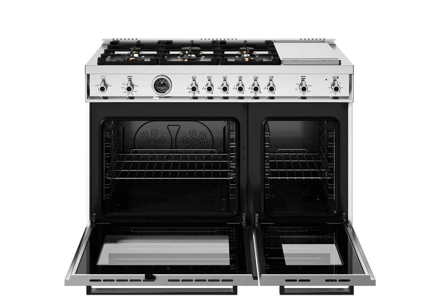 Bertazzoni Professional Series ranges bring the authentic experience of Italian cooking into your home. The cooktop is designed for versitility and efficiency. The dual-ring power burner is a high-efficiency burner with separately controlled flames can handle both delicate simmering and powerful searing with 750 to 19,000 BTU. All Bertazzoni ranges include a gas conversion kit for LP. The range also features a convenient electric griddle in stainless steel to offer even more cooking space and options. Bertazzoni's exclusive brass burners are designed and manufactured in Italy. The brass body of the burner creates a individual flame for the most percise heat delivery. Included in the center of the dual-ring power burner is a brass cap embossed with the beautiful winged-wheel corporate brand for a sophisticated and unique look. The oven features a gas broiler with an extra-wide European convection fan for balanced air-flow. This allows ensures even heat distribution for single and multi-level roasting and baking. Included with the oven is a telescopic glide shelf and soft-close door hinges for easy one handed operation. The door features edge-to-edge tempered glass windows to minimize heat loss. The range features the signature Bertazzoni ergonomic design knobs and metal handles that match perfectly with the many other Professional Series products offered by Bertazzoni.
