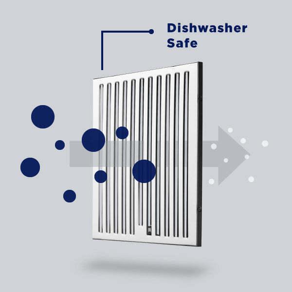 Dishwasher-Safe Baffle Filters Make your life easier today with our dishwasher-safe baffle filters! Throw them into your dishwasher and come back later. Different from others, our baffle filters incorporate professional cooking designs with deep grooves to collects cooking grease. No more grease drips!