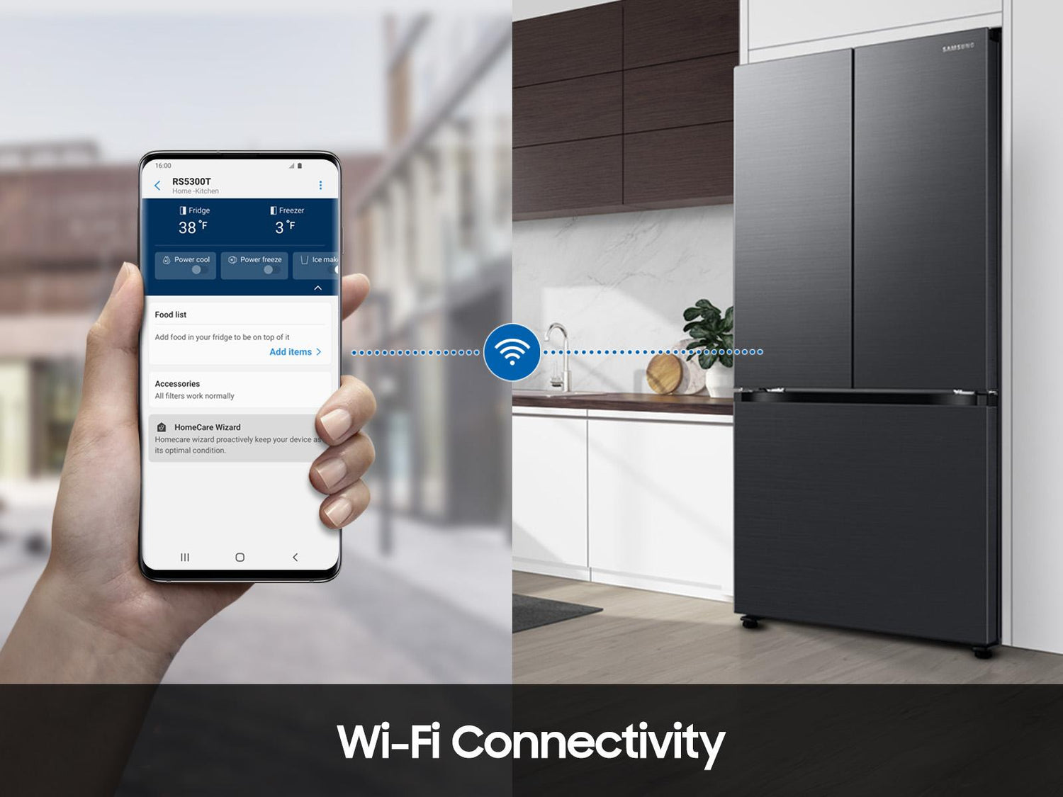 The SmartThings app alerts you when the door is left open, if there is an unexpected change in temperature and when it's time to change the water filter. Available on Android and iOS devices. A Wi-Fi connection and a Samsung account are required.
